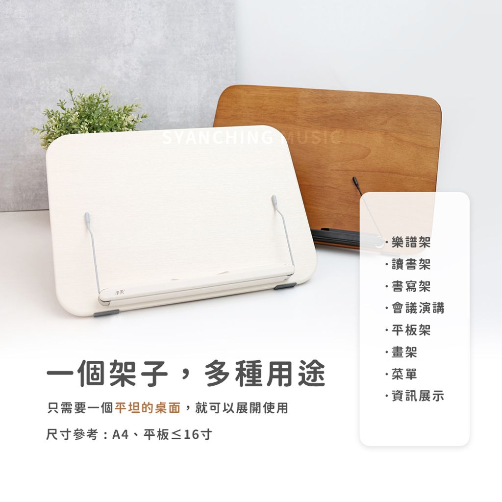 • 多功能 : 樂譜架、閱讀架、書寫架、平板架、筆電增高架、畫架、食譜架、資訊公告...